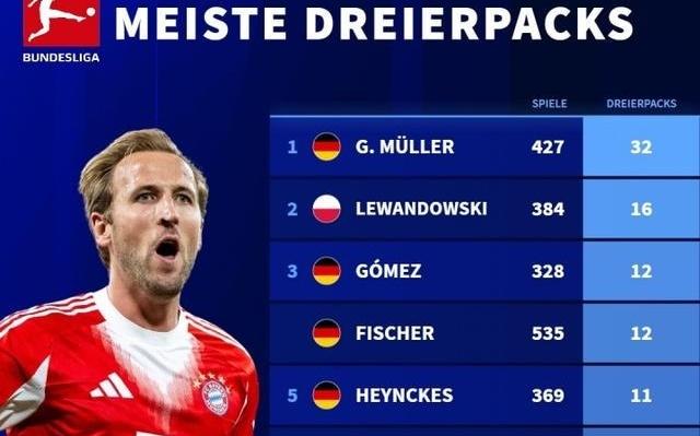 夸张!凯恩仅用67场就位列德甲戴帽榜第7,其余9人出场均超300场