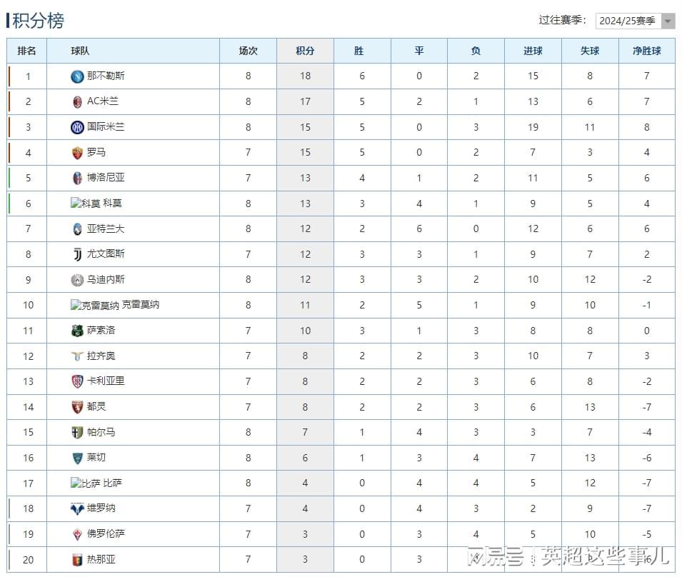 意甲最新积分榜:那不勒斯力克国米登顶,亚特兰大保住不败金身!