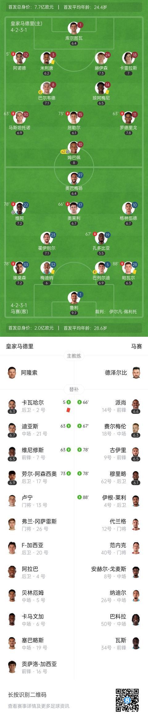 直播吧9月17日宣 欧冠联赛阶段第一轮,皇马坐镇主场伯纳乌迎战马赛。上半场,阿诺德伤退,居勒尔失误维阿爆射破门先拔头筹,罗德里戈造点姆巴佩点射。易边再战,卡瓦哈尔冲突顶牛吃到直红,维尼修斯造点姆巴佩点射双响。最终十人皇马2-1马赛。积分榜方面,皇马收获开门红3分,马赛0分。