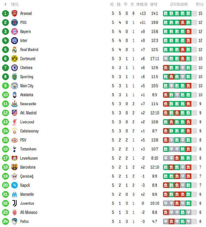 而本轮前保持不败的拜仁和国米均在本轮遭遇首败,其中拜仁在直接对话中输给阿森纳,这也是拜仁本赛季各项赛事首败,而国米则是被马竞绝杀。目前,大巴黎、拜仁、国米和皇马均为4胜1负,分别排名第2至第5位。