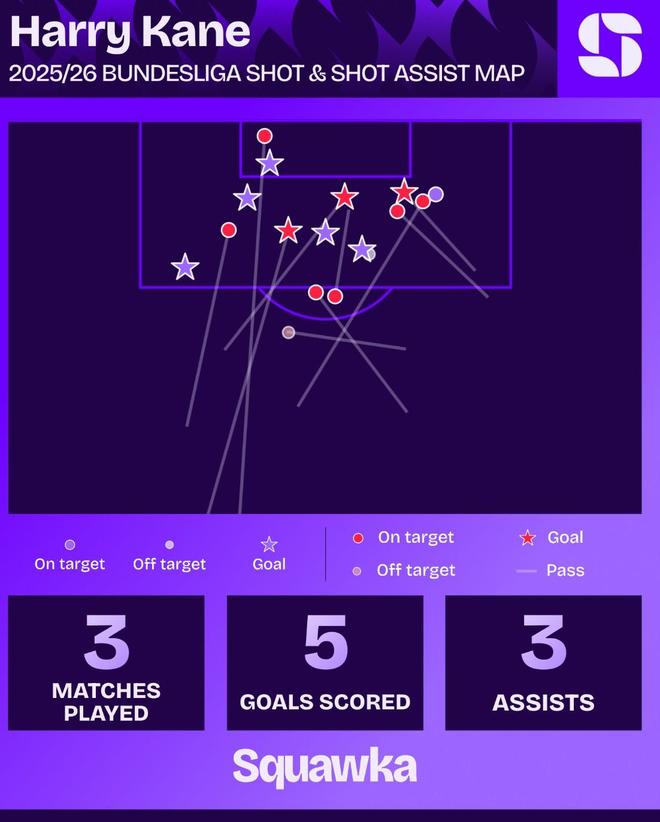 据数据网站Squawka统计,拜仁前锋哈里-凯恩本赛季在德甲联赛中仅用七次射门就打入五球。哈里-凯恩在本赛季的前三场德甲比赛中已经直接参与了8粒进球,包括5粒进球和3次助攻。
