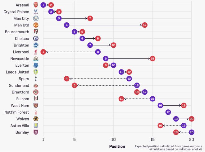 雷速体育10月1日宣 今日,国外知名数据机构公布了一项英超联赛前六轮预期积分排名的数据结论,其中目前位列榜首的利物浦期望排名仅位列第八,而排名第二的阿森纳期望排名是英超第一,实际排名第四的热刺预期排名仅为英超第12。