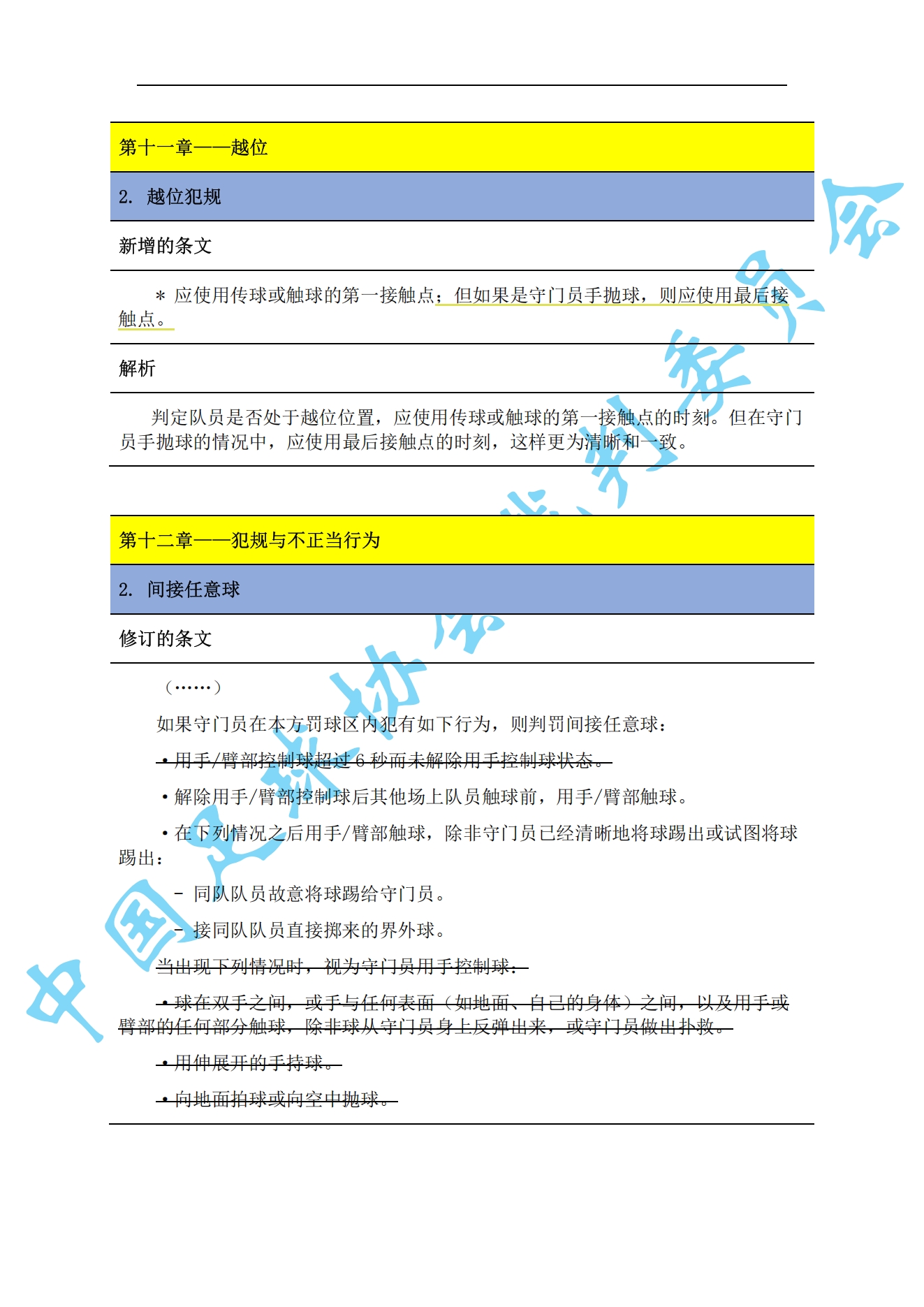 新规变更包括“守门员用手/臂部控制球超过 8 秒,将判给对方踢角球”、“竞赛方可以选择执行“队长专区”规则”等变动。